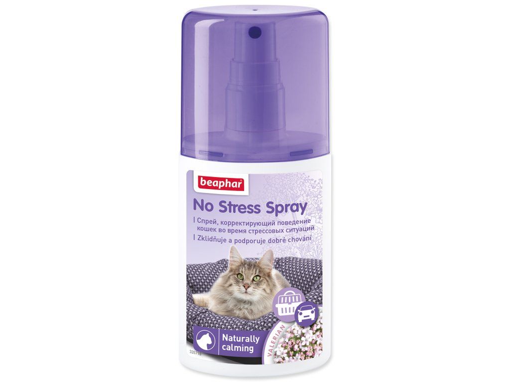 Roztok 10% kozlíku lékařského pro použití na přepravkách a pelíšcích ve kterých přebývá kočka v období stresu a neklidu. Vůně kozlíku je pro kočky známým atraktantem (přitahuje zvíře ke zdroji vůně). No Stress Spray rozptyluje kočky nacházející se ve stavu stresu nebo úzkosti a odvádí jejich pozornost od stresových faktorů a soustřeďuje je na předměty ošetřené sprejem. Návod k použití: sprej použijte v místnosti, ve které kočka projevuje stresové chování. Nastříkejte sprej na přikrývky, polštáře, hračky, i na místa, kde se kočka často pohybuje. Za účelem prevence další stresové reakce sprej neaplikujte přímo na kočku!