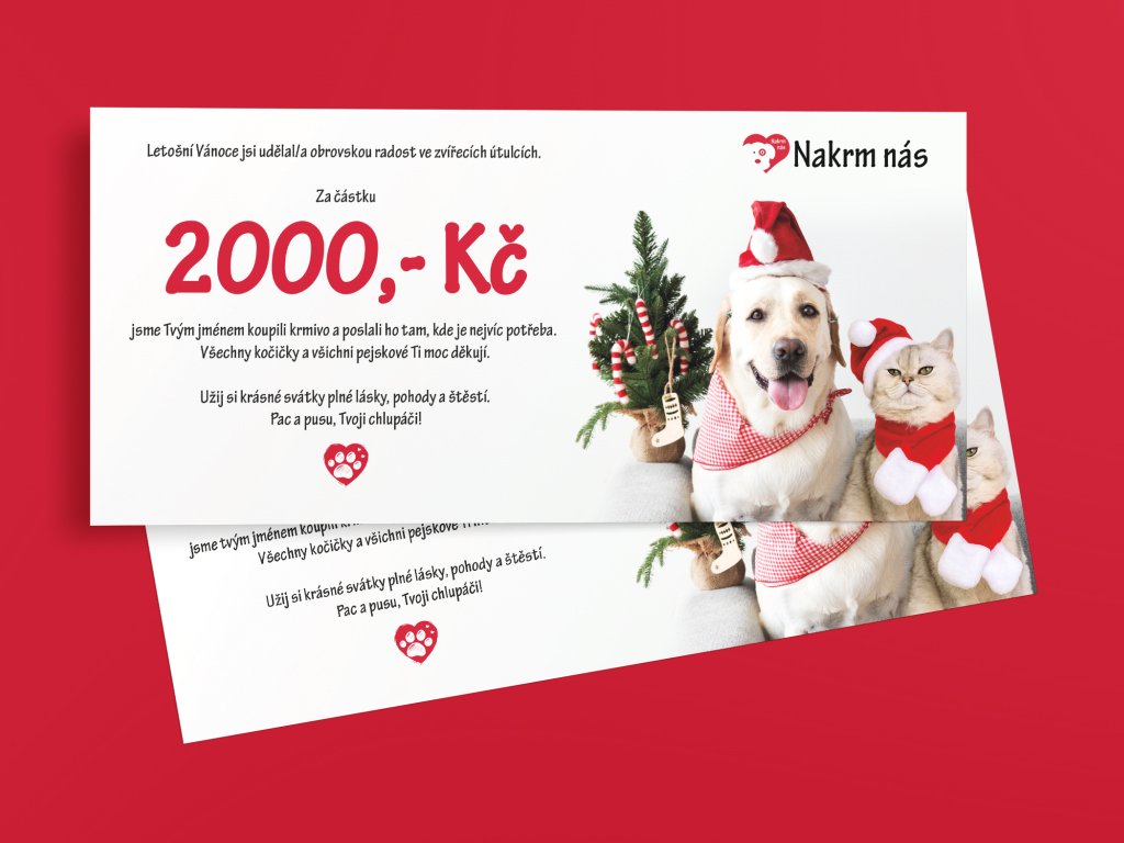 Kupte pro své blízké dárek s dobrým pocitem. Přispějte 2000 Kč a my za to nakoupíme konzervy, granule či stelivo tam, kde to aktuálně nejvíce potřebují. Do 48 hodin vám přijde do emailu krásný a originální voucher, který budete moct pod stromeček nadělit vašim blízkým.