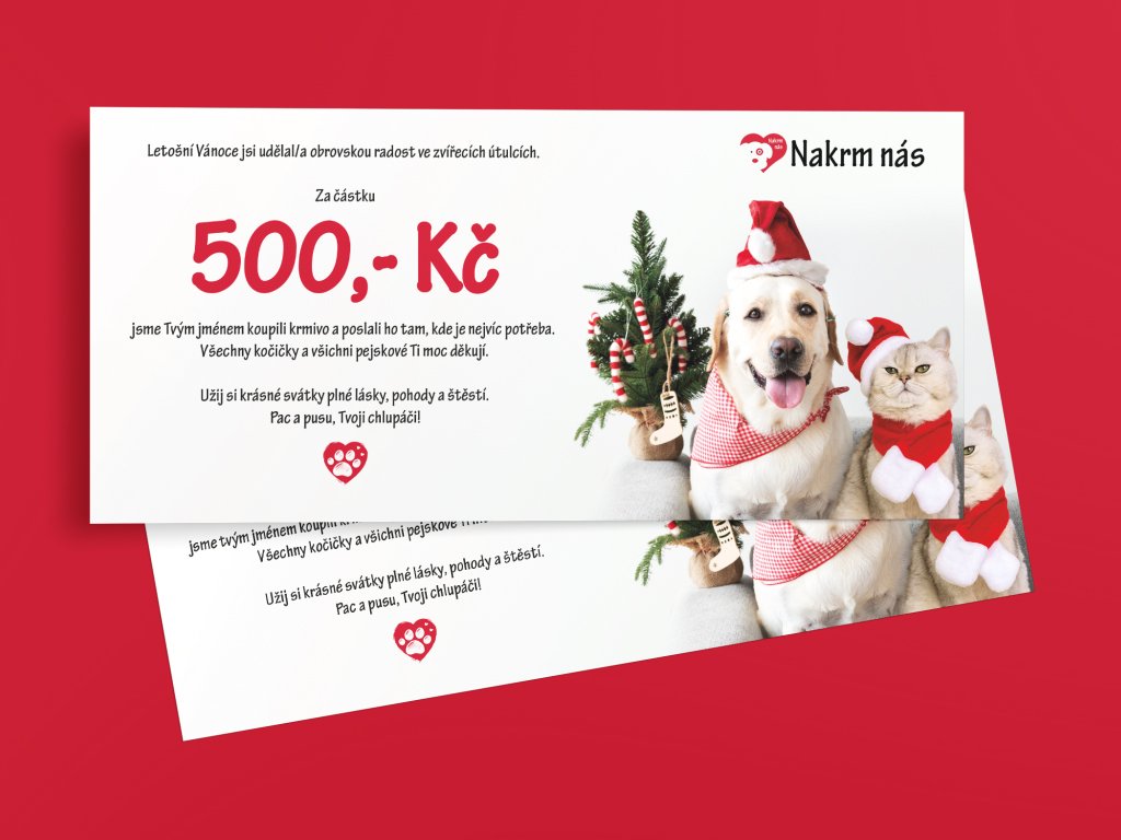 Kupte pro své blízké dárek s dobrým pocitem. Přispějte 500 Kč a my za to nakoupíme konzervy, granule či stelivo tam, kde to aktuálně nejvíce potřebují. Do 48 hodin vám přijde do emailu krásný a originální voucher, který budete moct pod stromeček nadělit vašim blízkým.